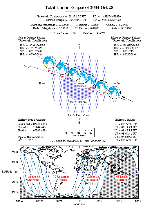 In noaptea de 27/28 octombrie 2004 Luna se va afla in constelatia Aries, avand un diametru de 30'. Luna va rasari in jurul orei 18h00m in seara de 27 octombrie. Eclipsa va incepe sa fie observabila pe la ora 3h45m (28 octombrie) mai ales in zonele cu cer curat. Apoi eclipsa se va desfasura conform datelor din tabelul de mai jos iar Luna va cobori tot mai mult pe bolta cereasca pana in jurul orei 8h00m cand va apune. Precizez ca orele amintite sunt in ora de vara (UT+3).