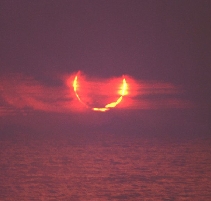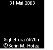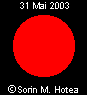 Rasaritul Soarelui in data de 31 mai 2003 variaza pe teritoriul Romaniei, acesta avand loc mai repede pentru localitatile situate in nord si est si mai tarziu pentru cele aflate la sud si vest. De aceea si magnitudinea eclipsei (fractiunea de diametru solar acoperita de Luna data in numar subunitar sau procente - %) este diferita. In tabelul de mai jos gasiti momentul rasaritului si azimutul pentru 61 de localitati din tara. Magnitudinea la rasarit este data numai pentru cateva orase si este cam relativa pentru ca rasaritul este calculat la altitudine 0 iar pe teren e cam greu de gasit un astfel de orizont. De aceea si orele date pentru rasarit vor varia depinzand de altitudinea orizontului la azimutul precizat pentru rasarit. Ca sa aveti o idee de aceasta intarziere va spun ca in Sighet daca am orizont de 1 Soarele va rasari cu 9 minute mai tarziu, 2 - 17 minute mai tarziu, 3 - 24 de minute mai tarziu si 4 - 31 de minute mai tarziu. E bine sa priviti rasaritul cu cateva zile mai inainte si sa cautati un orizont cat mai jos in zona rasaritului. Daca vreti magnitudinea la rasarit pentru alta locatie scrieti-mi. Apoi este data ora maximului, adica a momentului cand Luna acopera cea mai mare parte din Soare, altitudinea Soarelui pe cer si magnitudinea in numar subunitar. Urmeaza ora sfarsitului eclipsei, contactul IV, cand Luna inceteaza sa mai acopere discul solare. Este data altitudinea Soarelui si unghiul de pozitie (PA) a contactului IV, adica a locului unde Luna va parasi Soarele. Este masurat de la nord care are 0 si se masoara in sens retrograd (estul are 90, etc.).