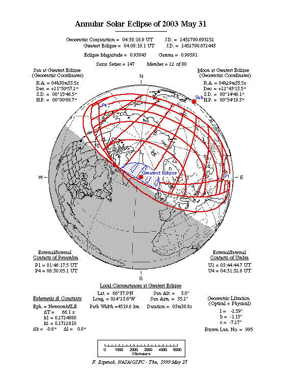 In dimineata zilei de 31 mai 2003 va avea loc o eclipsa de Soare, prima dupa marea eclipsa din ziua de 11 august 1999. Nu va fi o eclipsa totala sau inelara ci una partiala. De fapt la noi in tara se va vedea doar faza partiala a eclipsei in eclipsa este una inelara. Eclipsa este una mai deosebita deoarece axa conului de umbra a Lunii va trece pe suprafata terestra mult prea in nord. Din aceasta cauza nu intreaga umbra (de fapt antumbra formata in a doua panza a conului de umbra) va atinge suprafata Pamantului, zona nordica fiind dincolo de terminatorul zi/noapte. Ca rezultat este un "path" al umbrei in forma de "D". Eclipsa are loc cu trei saptamani inainte de solstitiul de vara si axa de rotatie a Pamantului este inclinata cu 22 inspre Soare. Vazuta de pe Soare umbra Lunii va trece pe deasupra polului nord si sub terminatorul zi/noapte. Astfel umbra se va deplasa pe suprafata terestra de la est la vest si nu invers cum e de obicei.