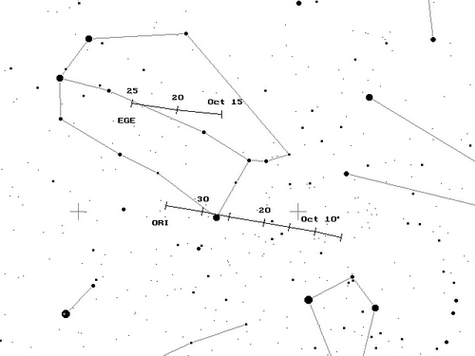 Diagrama de mai sus prezinta zona in care se afla radiantul Orionide in perioada 5 octombrie - 5 noiembrie. Meteorii Orionide intra in atmosfera cu o viteza foarte mare de 66 km/s, insa nu sunt foarte stralucitori.
