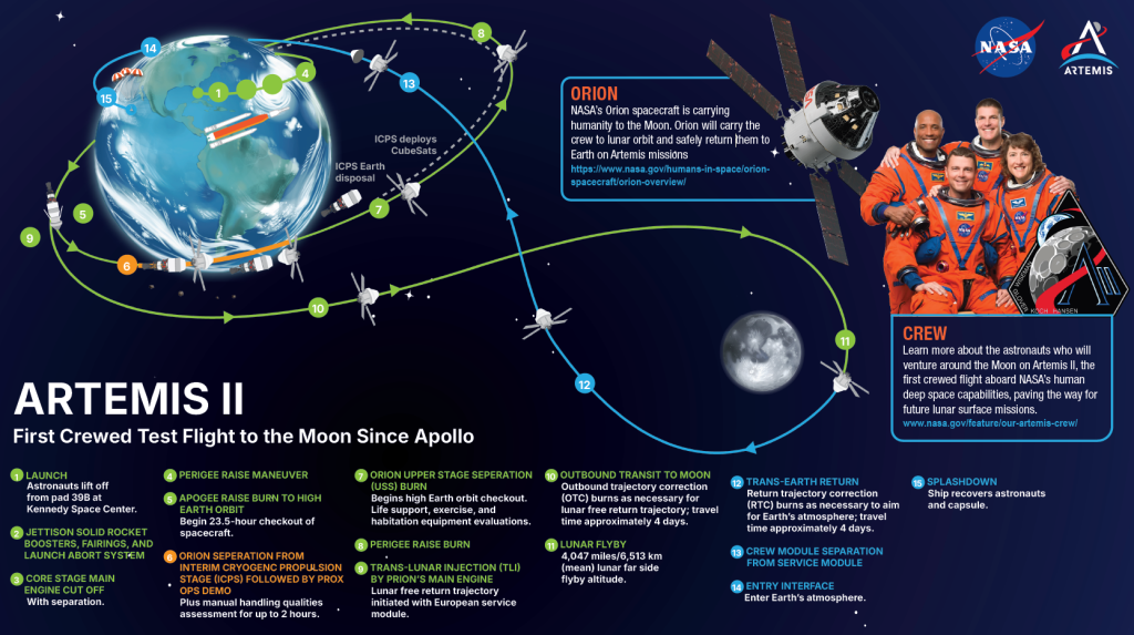 Iată programul aproximativ al momentelor importante din timpul survolului lunar realizat de capsula Orion cu 4 astronauți la bord, în cadrul misiunii NASA Artemis II.