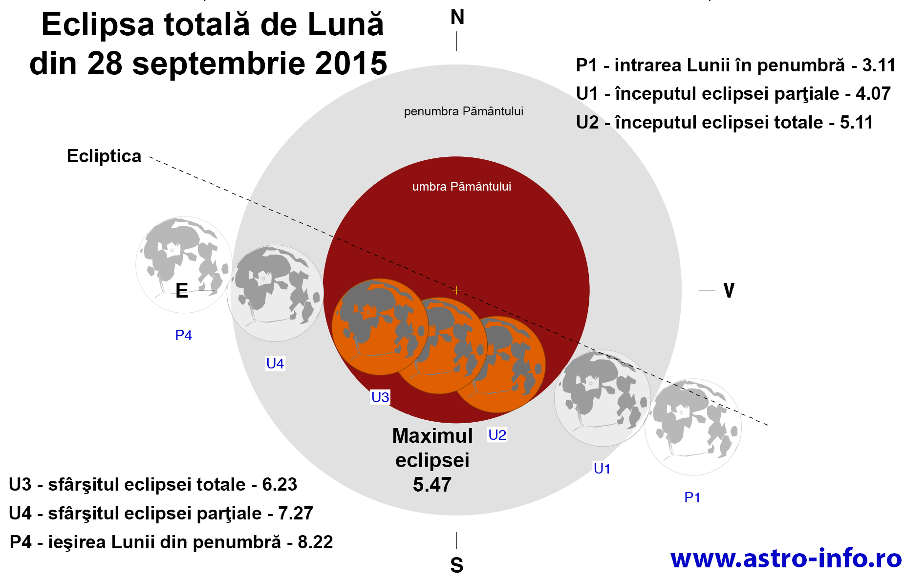 Eclipsa de Luna din 28 septembrie 2015 debuteaza la ora 3.11, odata cu intrarea Lunii in penumbra Pamantului, contactul Lunii cu penumbra avand loc in zona estica a discului lunar. In acest moment Luna se afla pe cerul sud-vestic, la altitudinea de 37°. Observatorii experimentati vor putea observa penumbra terestra pe discul lunar, incepand cu ora 3.40. Eclipsa partiala incepe la ora 4.07, contactul cu umbra terestra avand loc tot in zona estica a discului lunar. Luna continua sa coboare spre orizontul vestic, dar in acelasi timp cufundandu-se tot mai mult in umbra Pamantului. Luna ajunge in cel mai apropiat punct al orbitei sale la ora 4.46. La ora 5.11, Luna patrunde in totalitate in umbra Pamantului, incepand astfel eclipsa totala. In acest moment Luna se afla deja la altitudinea de 20° deasupra orizontului vestic. Cerul devine negru, iar pe bolta apar si stelele mai putin stralucitoare, dar si Calea Lactee, insa doar in locatiile fara poluare luminoasa. Discul lunar va avea o culoare rosiatica, insa nuanta sau nuantele exacte nu se pot estima. Culoarea Lunii in timpul eclipsei totale depinde foarte mult de starea, din acel moment, a atmosferei terestre care poate permite mai mult sau mai putin trecerea luminii rosii in interiorul conului de umbra. De-a lungul timpului au fost observate eclipse totale de Luna in care culoarea discului lunar a variat de la galben-orange, la rosu, maroniu sau chiar negru. Sa vedem ce surpriza ne rezerva aceasta eclipsa de Luna.