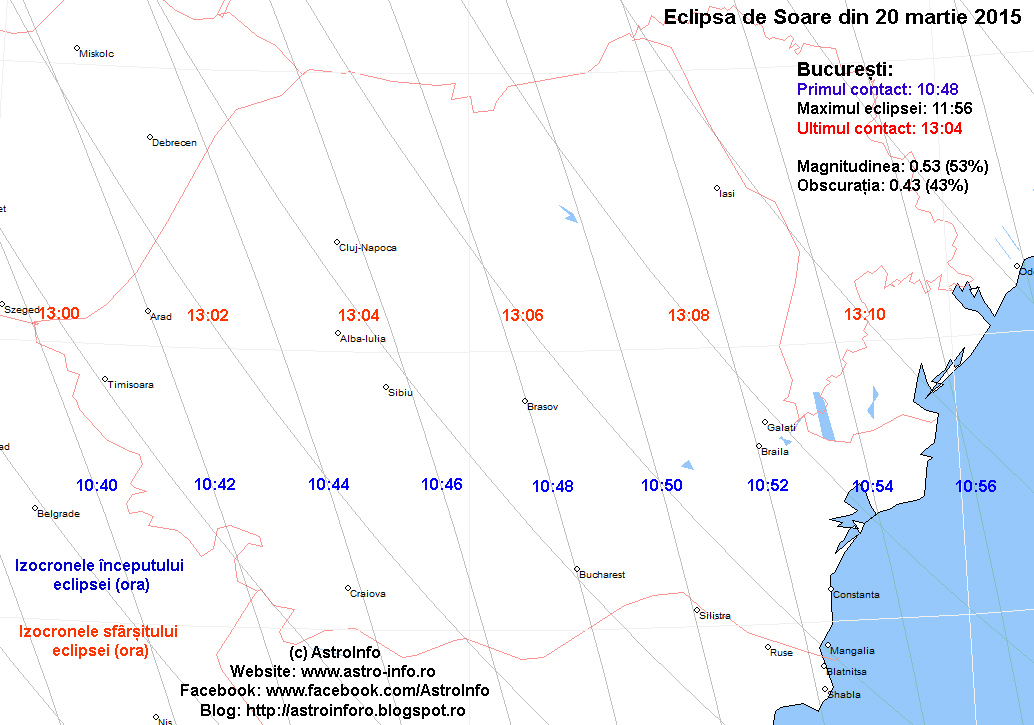 Nota: - Harta prezinta izocronele inceputului si sfarsitului eclipsei. Izocronele sunt liniile care unesc punctele de pe suprafata terestra in care fazele eclipsei au loc in acelasi timp. De exemplu izocronele inceputului eclipsei sunt liniile care unesc punctele unde eclipsa incepe in acelasi timp. Langa izocrone este trecut timpul la care acestea au loc.
