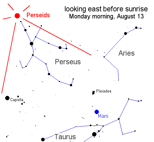 Diagrama de mai sus arata aspectul cerului estic inainte de rasarit si radiantul Perseidelor, luni, 13 august 2007.